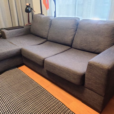 Aikanaan Askosta hankittu vaaleanharmaa sohva etsii uutta kotia. Verhoilu on ehjä, mutta se kannattaa puhdistaa. Sohvatyynyt ehjät, niiden päälliset ovat irrotettavat ja vesipestävät. Sohva on kaksiosainen, helpottaa kuljetusta. Oikeanpuoleisesta istuinosasta yksi jousi on poikki, joku näppärä saa sen korjattua kyllä.