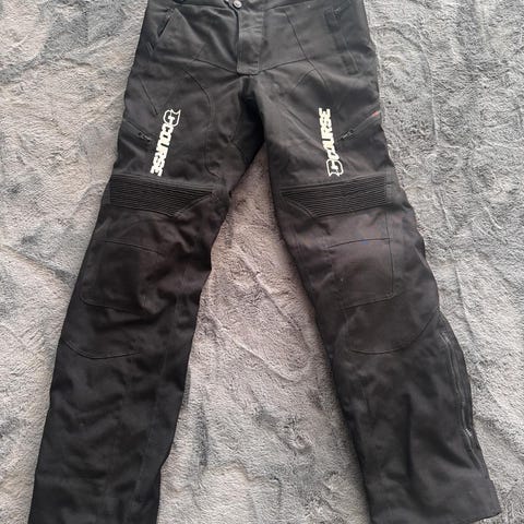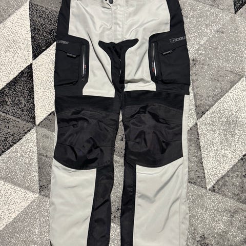 Miesten mustat tekniset housut. Pitkät housut, joissa vahvikkeet polvissa ja takapuolessa sekä vetoketjut lahkeissa. Sopivat esimerkiksi ulkoiluun tai muuhun aktiiviseen käyttöön. Materiaali vaikuttaa olevan ohutta, kevyttä ja hieman joustavaa teknistä kangasta. Housuissa on kiristysnauha vyötäröllä ja taskuja sivuilla. M/L koko