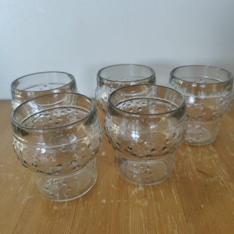 Myydään 3 kpl Nanny Stillin suunnittelemia ja Riihimäen lasin valmistamia Lumihiutale-juomalaseja. Korkeus 8,5 cm, suurin halkaisija n. 8,5 cm. Yhteishinta 6 euroa.
