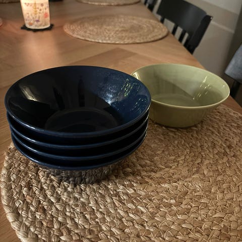 Iittala Teema tummansiniset mukit, ovat olleet käytössä mutta siistit ja käyttökelpoiset kumminkin. Yhdessä mukissa näkyy pieni kuluma reunassa.