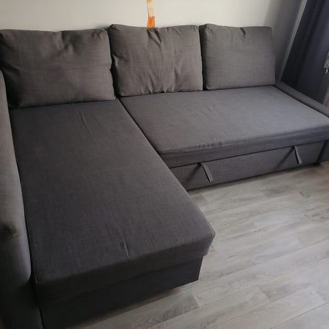 IKEA vuodesohva harmaalla kangasverhoilulla. Sohvassa on L-muotoinen kulmaratkaisu, jossa toisella sivulla on leveämpi istuin- tai lepotaso. Verhoilu on harmaata, hienokuituista kangasta, jonka pinnassa on kevyt kudoskuvio. Hyvässä kunnossa. Divaanissa hyvin säilytystilaa. Vuodesohvalla voit majoittaa mukavasti esim. vieraasi.