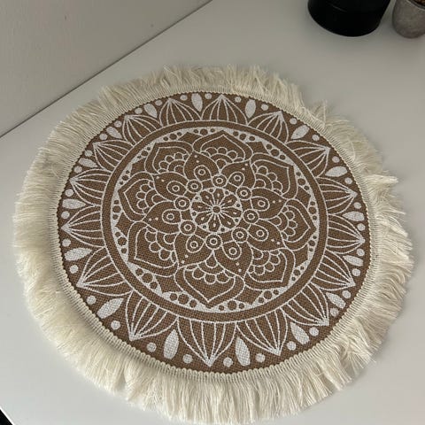 3 kpl virkattuja, pyöreitä koristeliinoja. Suurin, luumun värinen dia 31 cm, pienempi luumun värinen dia 21 cm . Vaalea lila dia 26 cm. Käyttämättömiä. Pm. 6,90e.