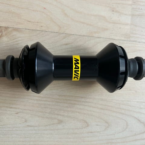 Todella hyväkuntoinen etukiekko, vain pari pientä naarmua jotka näkyy kuvassa. Kiekko on täysin suora ja laakerit ovat erinomaisessa kunnossa. Alkuperäinen tubeless teippi on hyvässä kunnossa ja on täysin ilmatiivis. Jäänyt itsellä tarpeettomaksi.