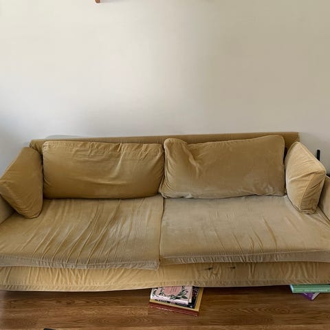 VARATTU Annetaan 155-160 cm leveä sohva, tumman harmaa. Selkätyynyt irrotettavat. Istuintyynyjen välistä kangas hiukan revennyt. Nouto Kalliosta, omat kantajat mukaan.