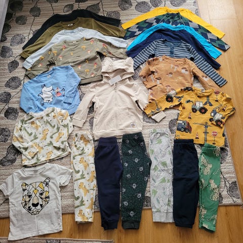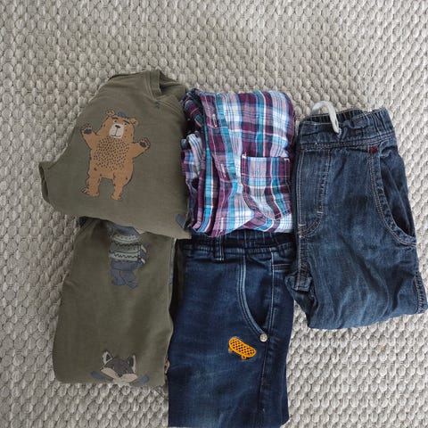 Poikien vaatepaketti, kokoa 98-104. Tumman sinisessä paidassa pari tarhaa oli jo itselle ostaessa käytettynä, en ole yrittänyt puhdistaa sen kummemmin (näkyy kuvassa).