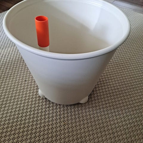 Ruukussa vesisäiliö ja kasteluletku ja mittatikku näyttää veden määrän