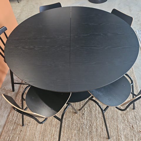 Materiaali: Kaksiosainen pöytälevy on tammea, joka on pinnaltaan lakattu ja teräsharjattu. Mustat pulverimaalatut metallijalat.