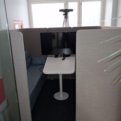 Neuvottelupöytä ja kokoustuoleja 9kpl. Pöydässä (280cm x 100cm) on puunvärinen, soikeahko suorakaiteen muotoinen kansi ja mustat metallijalat. Pöydällä on näkyvissä tyylikäs pop-up toiminnolla varustettu tornipistorasia mihin voi liittää esimerkiksi neuvottelutekniikka. Tuoleissa on vihreä verhoilu, mustat metallirungot ja puunväriset käsinojat. Tuolit ovat pinottavia, mikä helpottaa säilytystä ja tilan muuntelua. Kokonaisuus soveltuu neuvottelu- tai kokoustilaan, koulutuksiin tai muihin ryhmätilaisuuksiin.