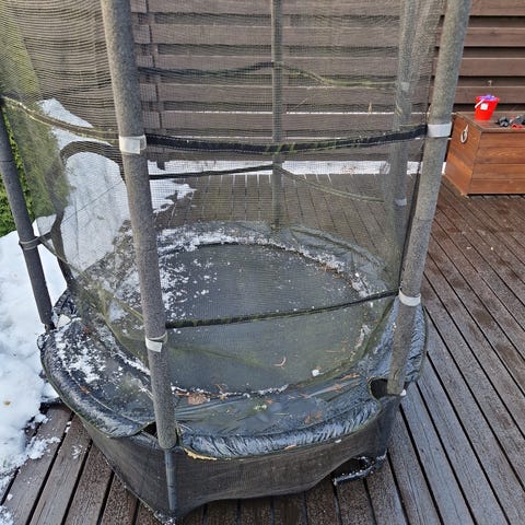 Ulkotrampoliini on hyvässä kunnossa; jouset vaihdettiin viime vuonna. Trampoliinin verkko on tyydyttävässä kunnossa. Koko 244