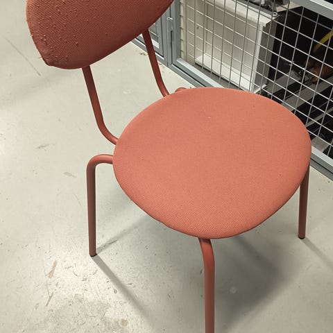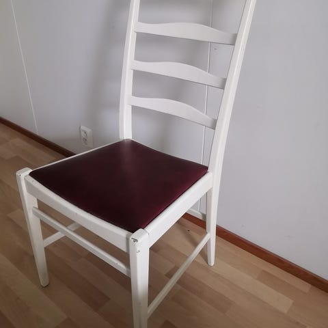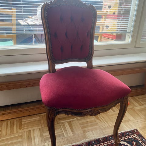 Putkirinkoinen tuoli jossa puuta käsinojissa. Verhoilu ja pehmusteet vaatii uudistuksen mutta runko hyvässä kunnossa.