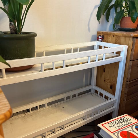 Puinen hyllykkö, jossa kohtalaisesti käytön jälkiä. Voi käyttää nykyisessä kunnossa, mutta pienellä hiomisella ja esim. maalilla tulisi tosi hyvä. Täyttä puuta, joten kunnostus onnistuu helposti.