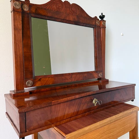 Vanha alkuperäiskuntoinen peilipöytä/kampauspöytä. Ollut vain yhdessä perheessä. Kaunis viilu/teak/tiikki puu materiaalina. Käytönjälkiä on ja peili vanha. Ilman peiliäkin tätä voisi käyttää sivupöytänä.