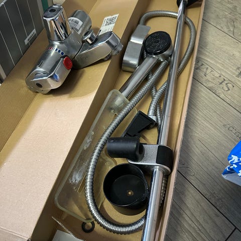 Hansgrohe suihkusetti termostaattihanalla ja kahdella suihkupäällä. Settiin kuuluu yläsuihku (sadesuihku) sekä käsisuihku korkeussäädettävällä suihkutangolla. Pintamateriaali on kromattu metalli. Termostaattihana mahdollistaa veden lämpötilan ja virtauksen säädön. Soveltuu asennettavaksi suihkutilaan seinäkiinnityksellä.