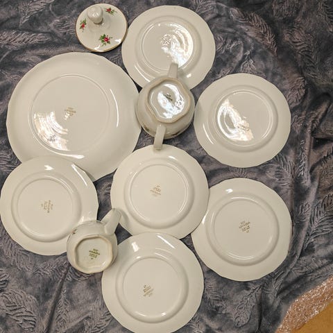 11 kuppia, 11 asettia, 11 kakkulautasta, sokerikko ja kermakko.