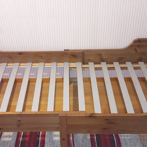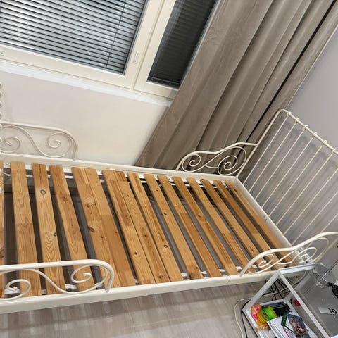 IKEA jatkettava lastensänky. Sängyssä on valkoinen metallirunko koristeellisilla päädyillä ja puiset sälepohjat. Pituutta voi säätää lapsen kasvaessa. Soveltuu yhdelle lapselle tavallisen patjan kanssa. Metallirunko ja sälepohja tarjoavat tukevan alustan patjalle.