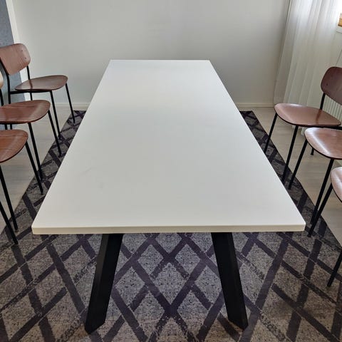 Pöydän kansi on valkoista laminaattia, mustat tolppajalat.