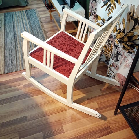 Myynnissä oiskohan 60-luvulta oleva keinutuoli, valmistajan leimoja ei mistään löytynyt. Tässä meidän pappa on kiikustellut vuosikymmenet, nyt on käynyt tarpeettomaksi ja joutaisi seuraavalle kiikkujalle. Jalan- ja kädensijoista maali kulunut muuten keinutuoli on jämäkässä kunnossa.
