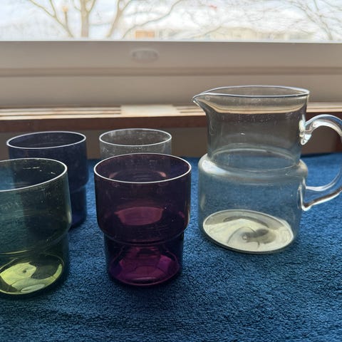 Kaksi värillistä, vanhaa lasia, ehkä Kaj Frankin suunnittelemia. Merkki joko viola, kartio...Vanhoja ovat. Kolmas on vanha sinappilasi. Nouto tai postitus. Yhteishinta 10 e.