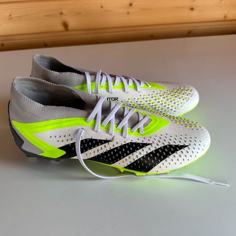 Adidas Predator jalkapallokengät. Väri valkoinen, harmaa ja neonvihreä. Nappulapohja on suunniteltu luonnonnurmelle tai keinonurmelle. Päällinen on sukkamallinen ja nauhaton, mikä helpottaa kengän pukemista ja antaa tiiviin istuvuuden. Kengät soveltuvat jalkapallon pelaamiseen ulkokentillä. Koko 40,5