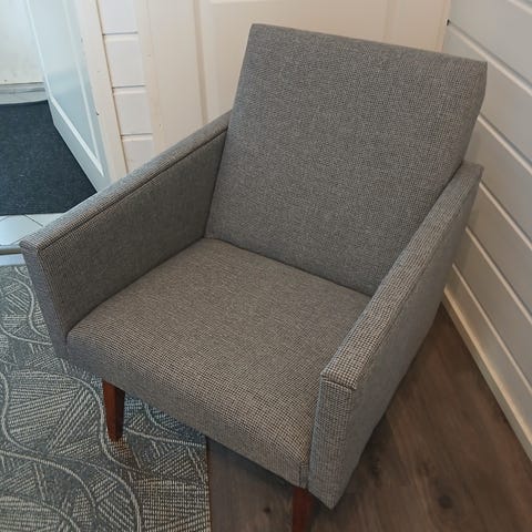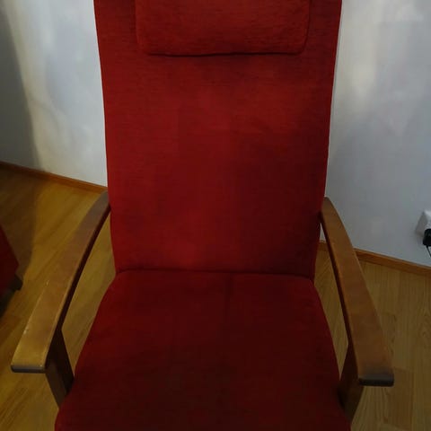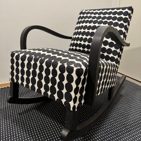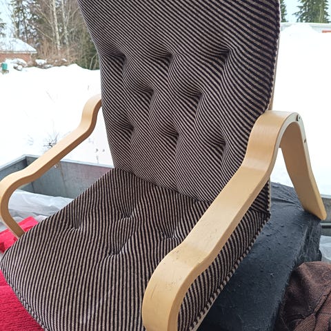 Nojatuoli valkoinen, verhoilu uusittu. Maalipinnassa joitakin kolhuja.