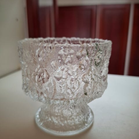 Tapio Wirkkalan Nuutajärvelle suunnittelemat, lasiset jälkiruokakulhot 1960-luvulta lapsuuskodistani. 6 kpl.
