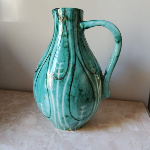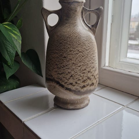Kupittaan Saven maljakko. Malli on vanhempi mutta kyseinen valuva lasitekoristelu tumman tuontisaven pintaan oli käytössä 30/40-luvulla.