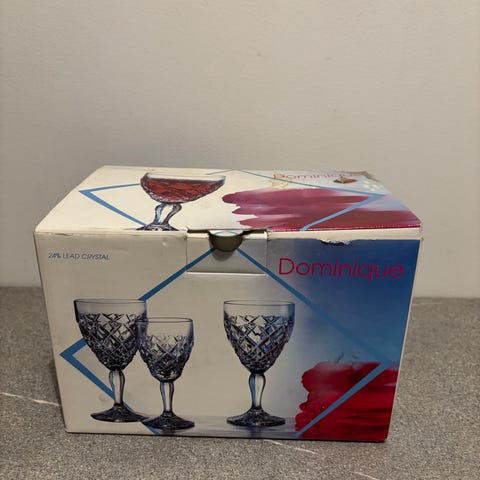 Käyttämättömät tinajalalliset shamppanjalasit. Jaloissa sormukset.