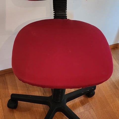 Musta hyväkuntoinen toimistotuoli, jossa on pehmustettu istuin ja selkänoja.