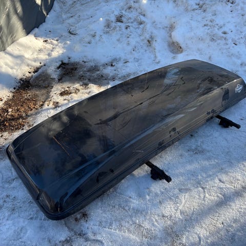 Hyväkuntoinen Thule- laatua oleva Jetbag- suksiboksi. Hyvin mahtuu pitkätkin sukset pituudeltaan sisään. Boksi aukeaa toiselta sivulta.