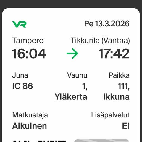 VR junalippu reitille Tampere - Tikkurila - Helsinki Lentoasema, IC 150. Lähtö 14.3.2026 klo 09:00. 2 henkilön hytti: 1 aikuinen, 1 opiskelija. Mahdollisuus paluulippuun 22.3.2026 aamulla.