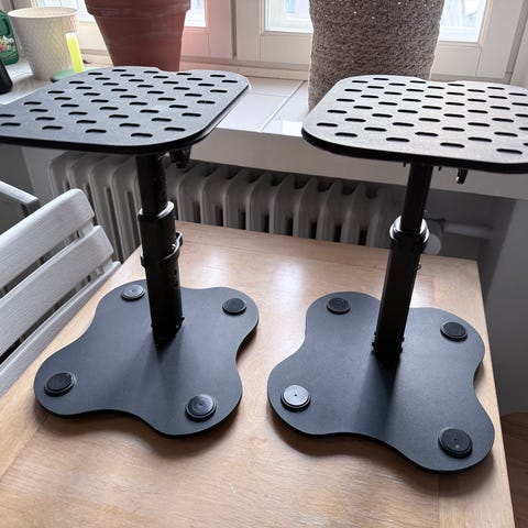 Hylly seisoo tällä hetkellä järeillä umpirautaisilla ja kovakromatuilla vaimennuskartioilla. Nämä saa mukaan 50€ lisähinnalla. Kartiot on toki helppo/halpa korvata myös M12 hattumuttereilla.