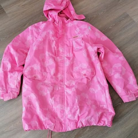 Hyvännäköinen välikausitakki, joka vähän hylkii vettä. Väreinä pirteä kullanhohtoinen/okrankeltsinen ja farkunsininen.152 cm.