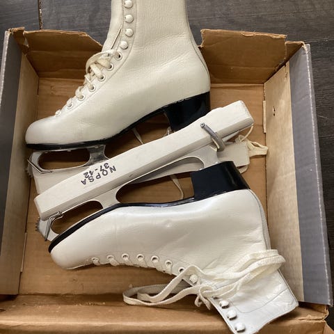 luistimet, koko 38. Väri valko-punainen vaaleanpunaisilla yksityiskohdilla ja koristekuvioilla. Nauhakiinnitys ja turkisreunus varressa. Soveltuvat muuhun luisteluun, esimerkiksi vapaa-ajan luisteluun ulkojäillä tai tekojääradalla.