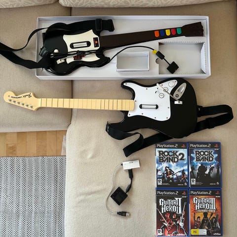 Playstation 2 Guitar hero setti alkuperäisessä paketissaan. Kitara hihnoineen, dongle ja peli.