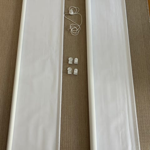 Valoisiin öihin Ikea Tretur valkoinen pimentävä rullaverho 100x195cm kiinnikkeineen. Rullan kotelo ja verhon alasivun kisko harmaat. Tukeva, napakkaa kangasta. Kunto moitteeton, tahraton.