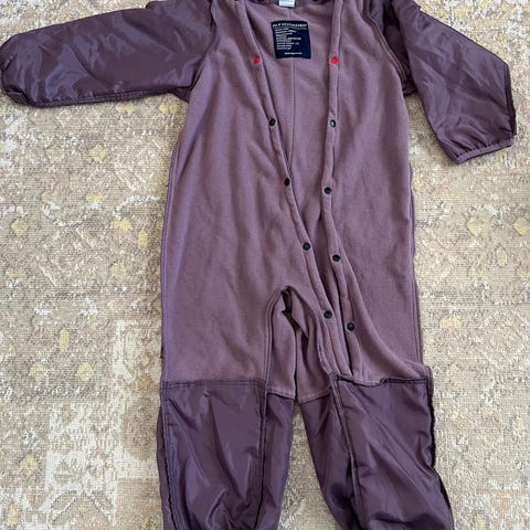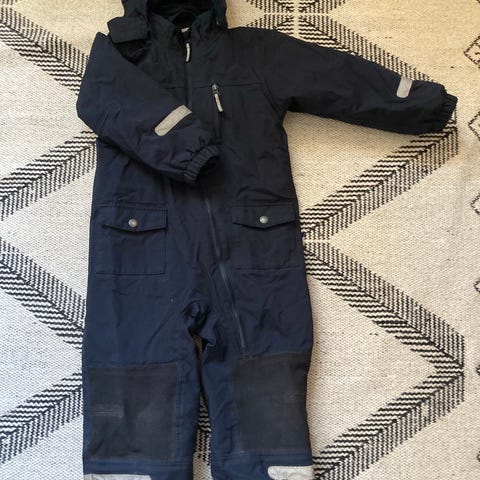 Tummansininen polarn o pyret kuorihaalari irrotettavalla fleecevuorella. Haalaria on käytetty, mutta yleisilme on siisti eikä siinä ole reikiä. Haalarista puuttuu toinen jalkalenkki ja lenkkien nappikiinnityket ovat irronneet.