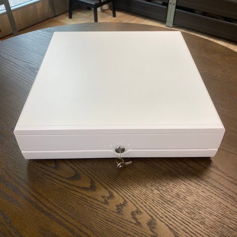 Metallinen sähköinen kassalipas avaimella. Lipas on väriltään harmaa ja siinä on etupuolella seteliaukko. Sisäpuolella on erilliset lokerot seteleille jousikiinnikkeillä sekä useita lokeroita kolikoille. Koko 41x41.5cm.