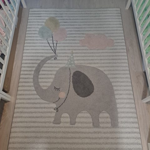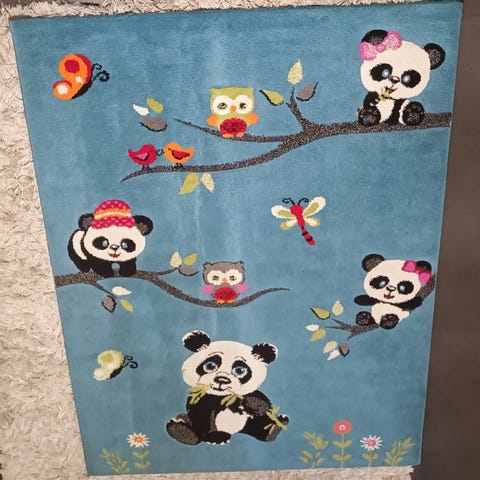 Matossa on raikas luonnonvalkoinen pohja ja erivärisiä ja -muotoisia lehtiä. Okran keltaiset leopardit viimeistelevät maton viidakkoaiheisen ilmeen.