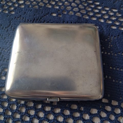 Hopeoitu pyöreä rasia kannella. Rasiassa on kohokuvioitu koristeellinen kansi ja pienet jalat pohjassa. Sisäosa on siniseksi viimeistelty. Sopii esimerkiksi pienten esineiden, korujen tai muiden pientavaroiden säilytykseen tai sisustusesineeksi. Merkkitietoja ei ole näkyvissä kuvissa. Saa tarjota myös