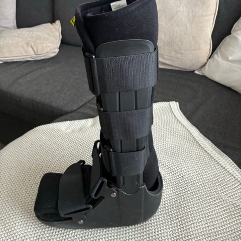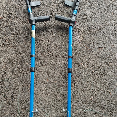 Aikuisten säädettävä kävelyortoosi koko 43-47 ja pari kyynärsauvoja jääpiikeillä. Ortoosi on säädettävä nilkka- ja jalkaterätuki, jossa on tarrakiinnityksellä kiristettävät remmit ja muovinen ulkokuori. Kyynärsauvoissa on siniset muoviset yläosat heijastimilla ja säädettävät metallivarret. Sopii alaraajavammojen ja leikkausten jälkeiseen liikkumisen tukemiseen lääkärin ohjeen mukaan.