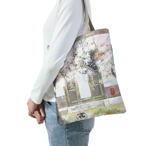 Tätä crossbody -laukkua voi käyttää myös vyölaukkuna. Kaksipuoleinen, oranssikuvioinen laukku tulee pikkukukkarolla.
