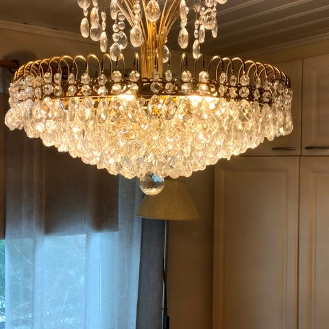 Todella nätti, hieman paremmin omaan silmään sopivaksi modattu mummolamppu 😍 kuusi polttimoa ja nämä saa ainakin itellä tuplakatkaisimesta joko kolme tai kaikki kuusi käyttöön. Edellisen putsauksen jäljiltä, josta aikaa, kristallit vähän vinkkelissä eli tämä tulee seuraavalle pesun ja kristallien suoristamisen tarpeisena. Tätä en halua postittaa, kun saattaa siinä rikkoutua eli vain nouto ja samalla tarkistus jotta on mieleinen 😊 Suoraan käytöstä ja lamput kuuluu hintaan.