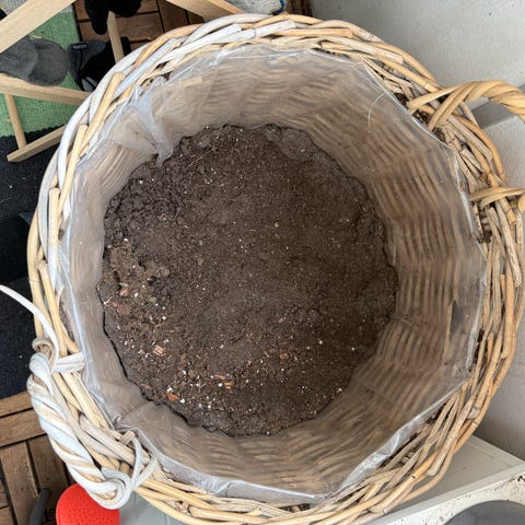 Punottu kori, jossa kaksi kantokahvaa. Kori on ruskeasävyinen ja sisäpuolella on läpinäkyvä muovivuori. Sopii esimerkiksi pyykkikoriksi, säilytyskoriksi tai istutuskoriksi sisäkäyttöön. Materiaalina punottu luonnonmateriaali, kahvat vaaleampaa punosta.