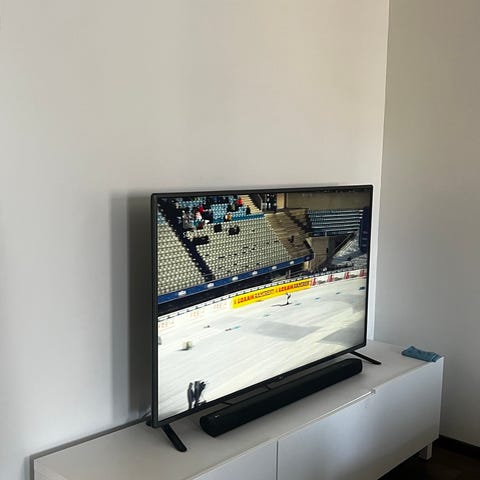 Kannessa reikiä kaapeleille, näkyy kuvissa. Tv-taso seisoo kuvissa puulaatikoilla jotka eivät kuulu kauppaan.