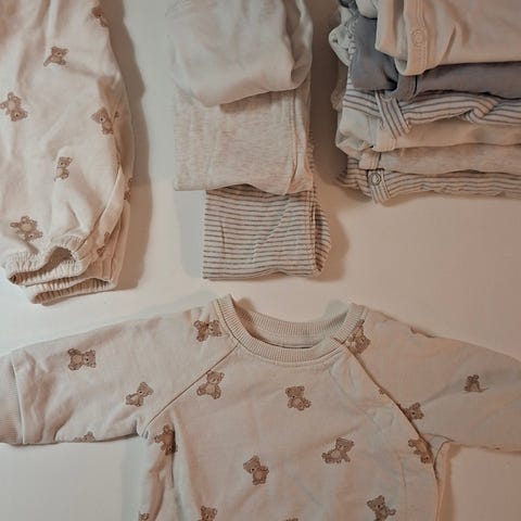 Meille riitti nämä vaatteet ensimmäisiksi kuukausiksi, joten tästä saat helpolla unisex-vaatepaketin vastasyntyneelle tai pienelle vauvalle, 24 kpl vaatteita yhteensä 30€.
