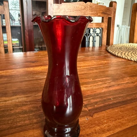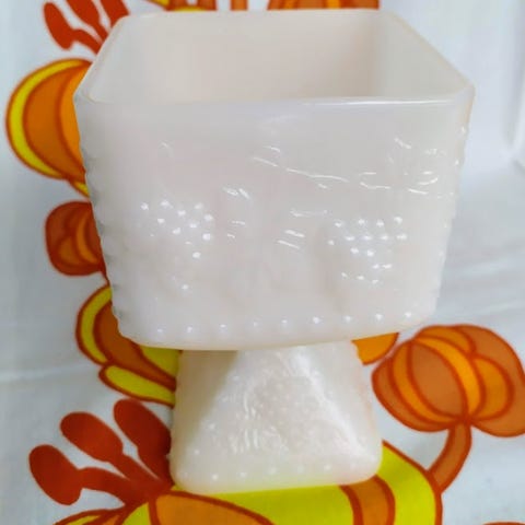 Anchor Hocking kaunis rypäle/lehväkoristeinen jalallinen tarjoilumalja.