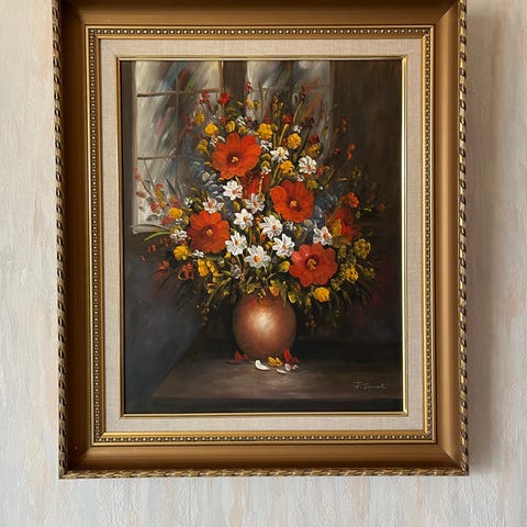 Kaunis kukka-asetelma taulu puukehyksineen. Taiteilijan singneeraus alareunassa. Sopii olohuoneeseen ym. Näkyvälle paikalle.