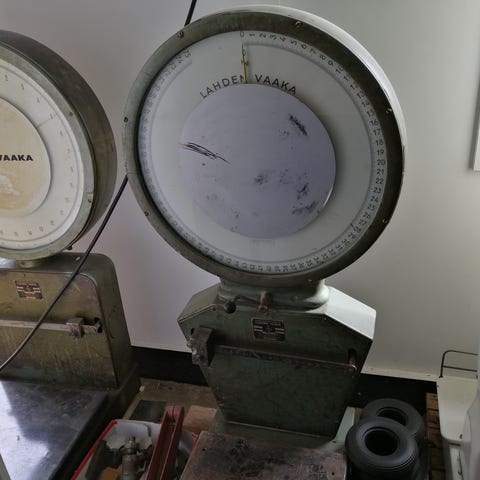 Rajun näköinen, mutta täysin toimiva mekaaninen vaaka.