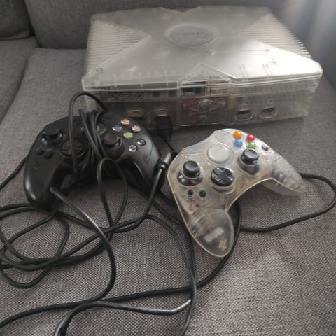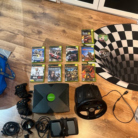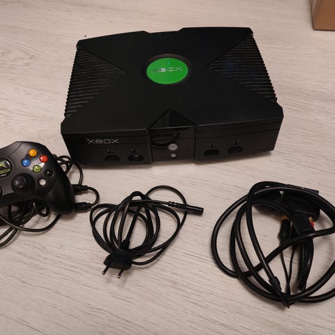 Microsoft Xbox pelikonsoli Joytechin kannettavalla näytöllä ja logitech ohjaimella. Konsoli on alkuperäinen Xbox-malli, johon on liitetty Joytech-merkkinen taitettava näyttö, jossa on sisäänrakennetut kaiuttimet ja kantolaukku.