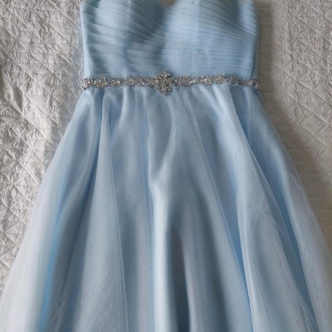 Zazabella taskullinen rippimekko, koko 38/M. Lyhyt, kellomainen helma ja satiininen materiaali. Mekossa on sinivihreä väri, ohuet olkaimet ja V-pääntie. Selkäpuolella on ristikkäiset nauhat ja avoin selkä. Sopii esimerkiksi juhla- tai rippimekoksi.